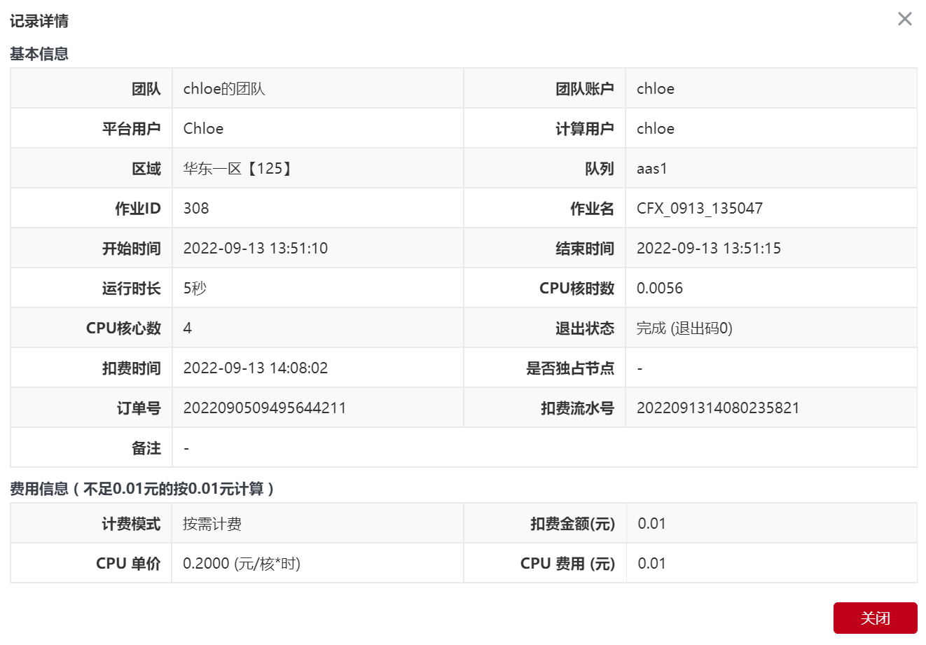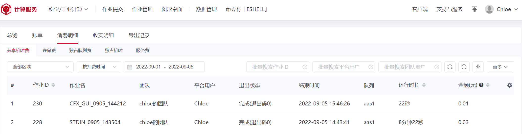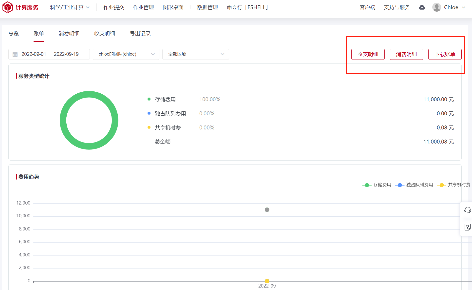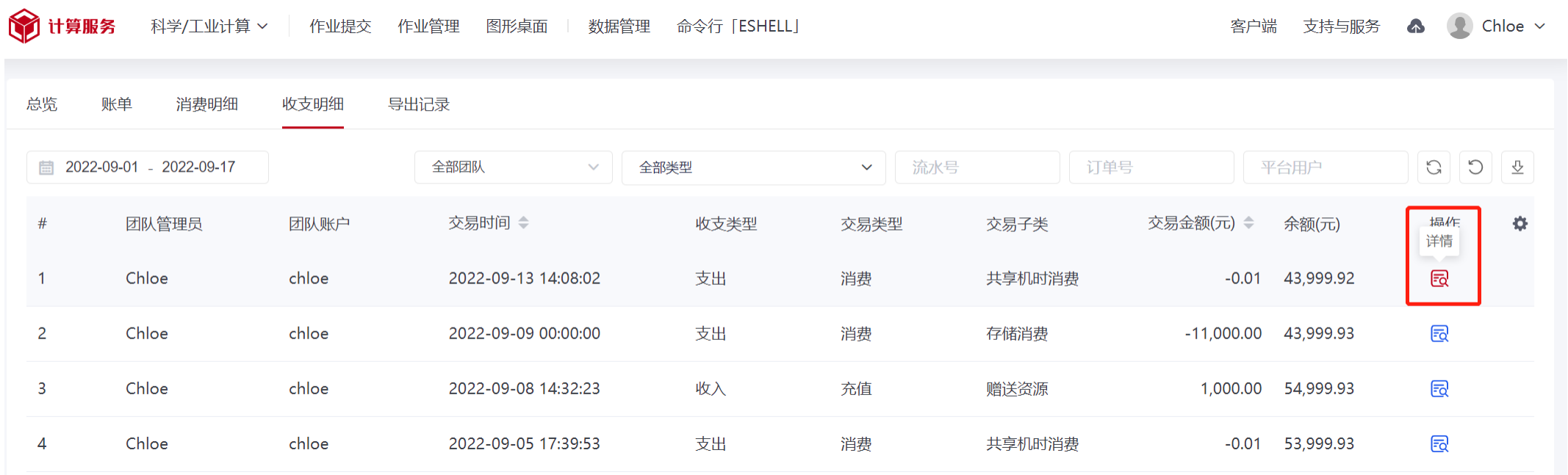 在账单中点击“收支明细”可查看您关联的账户在当前计算中心的收支详单,并将各项费用分类列出: