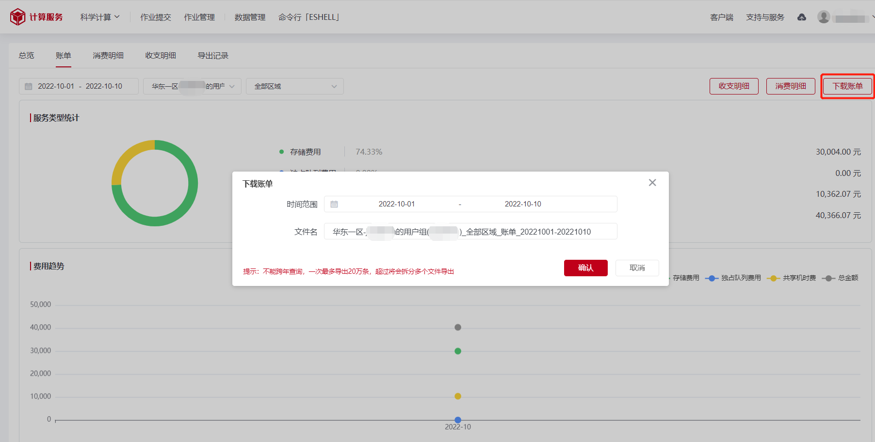 注:账单下载时间范围不能跨年查询,且一次最多导出20万条,超过将会拆分多个文件导出。
