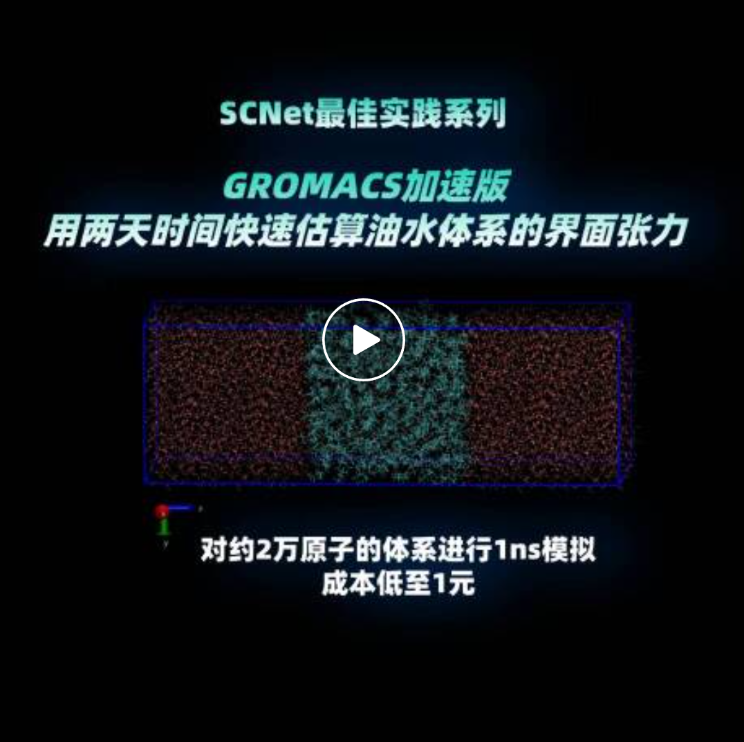 本期最佳实践,我们将在超算互联网平台使用 GROMACS v2023.2 加速版,对油-水体系的界面张力进行计算,此次分子模拟工作流设计思路是搭建油相模型——平衡——拉长模拟盒子——加入水分子——平衡——固定盒子形状模拟——计算界面张力。计算表明,基于国产异构加速卡,对约 2 万原子的体系进行 1ns 模拟,成本低至 1 元。
